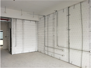 4、 在钢丝网架防火聚苯板的一侧浇注匀质防火保温材料