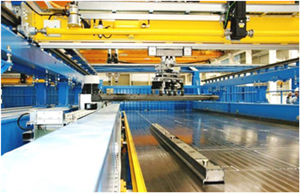 为了生产出高质量的混凝土预制构件,提高生产过程的自动化程度,中天节能全自动的机械手系统。入/出库机械手根据 ebos® 传输的 CAD 数据,从磁性边模库中选择提取出必要的边模。边模置放机械手根据构件的尺寸,把磁性边模准确地定位到底模托盘的平面,激活边模内置的磁铁。构件制成脱模后,拆模机械手通过扫描托盘,识别出磁性边模所在的位置,把它们抓取起来,放到传送带上。磁性边模将被自动输送到清洁机中进行清洁和上油润滑。最后,入库机械手会根据磁性边模的不同长度,把它们加以分类,放回到磁性边模库中。